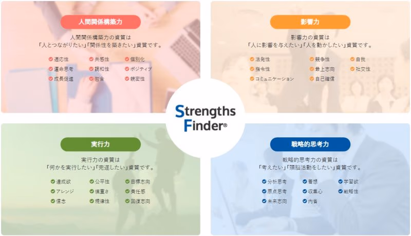 34の資質は才能を34の資質(似たような才能の集まり)に分類しています。上記4つのグループに分けられています。