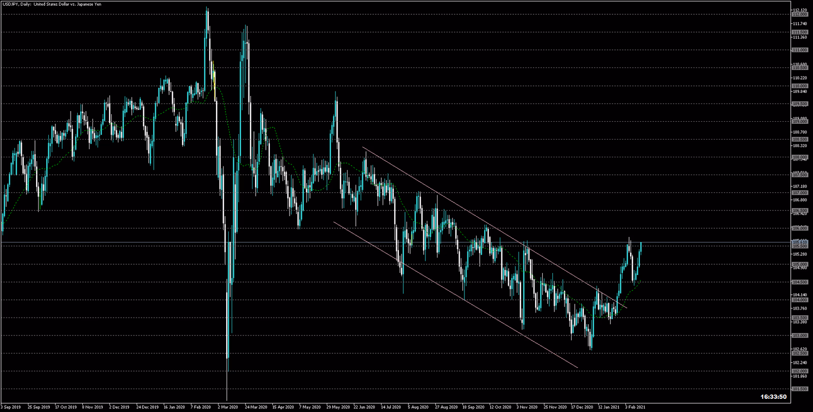 104.5円で騙しの安値から反転初めて高値目指して上昇しています。