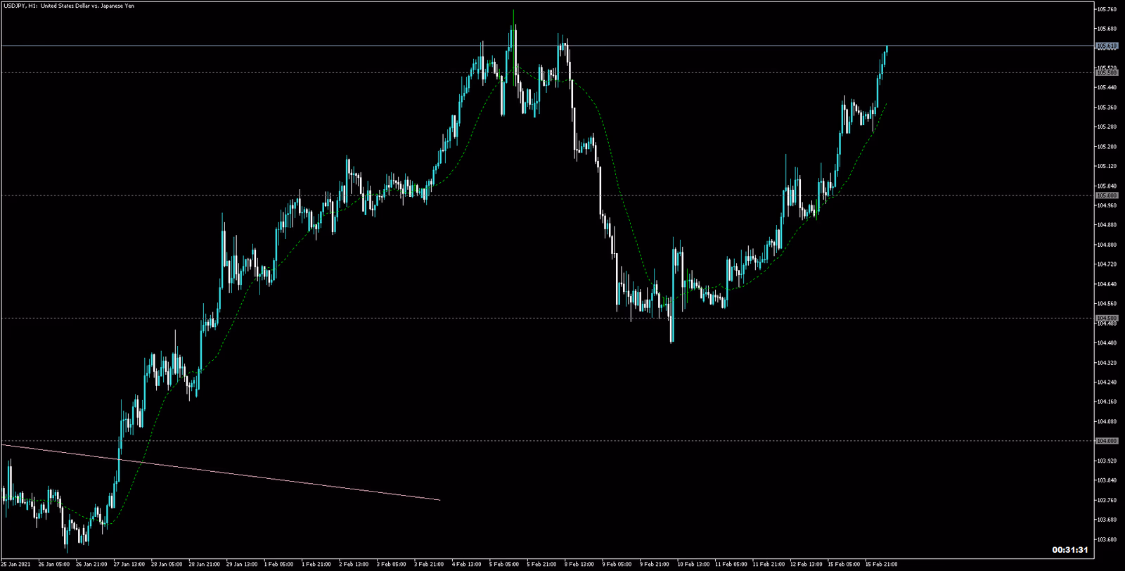 ●105.5円から売っている人。1H移動平均基準に下がっていました。104.5円割れ期待で売る人もあります。104.5円割れた瞬間に嬉しくて、安心しています。ところが急反発であっという間に含み損になった。損切りするしかなかったです。