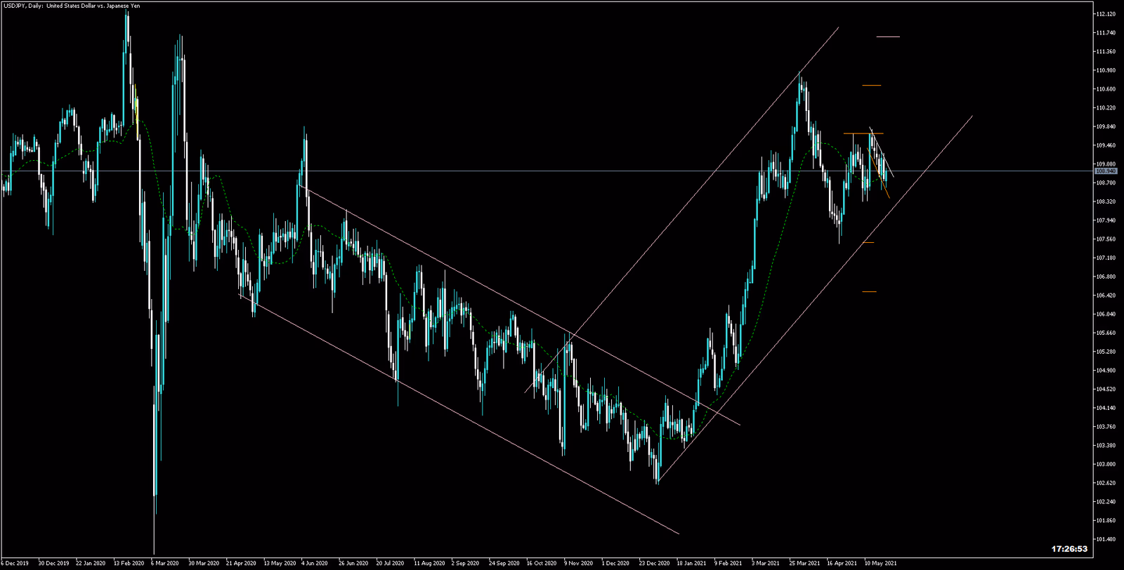 ドル円の日足チャートです。チャンネルを引いたら、現在今年の波も2つだけで、去年の下降トレンドを抜けた波、チャンネル上限から下限までの波。現在チャンネル下限付近でサポートされるかとうかを注目です。
