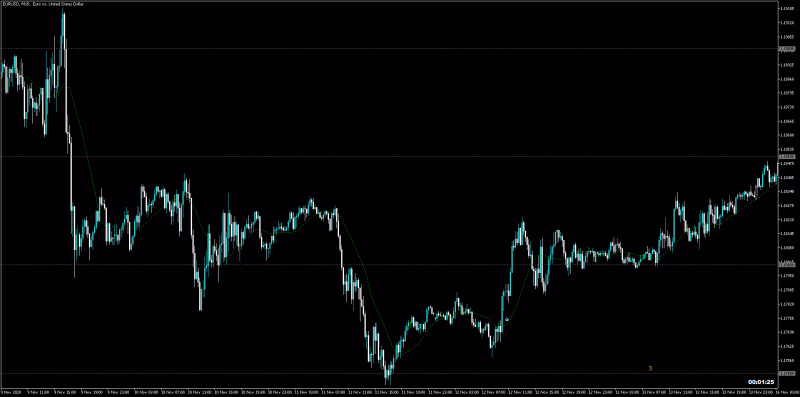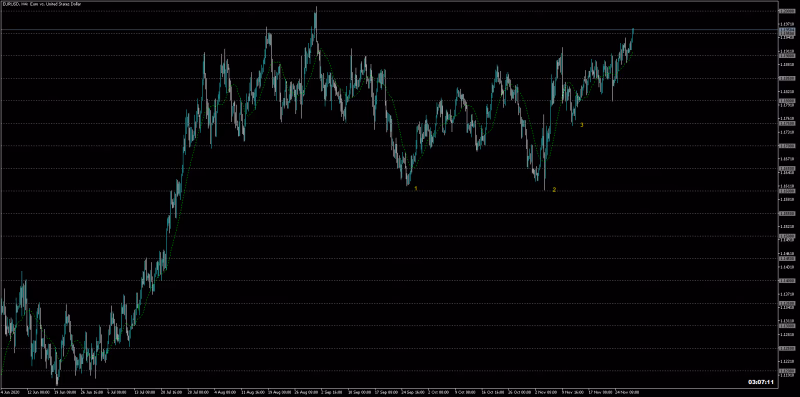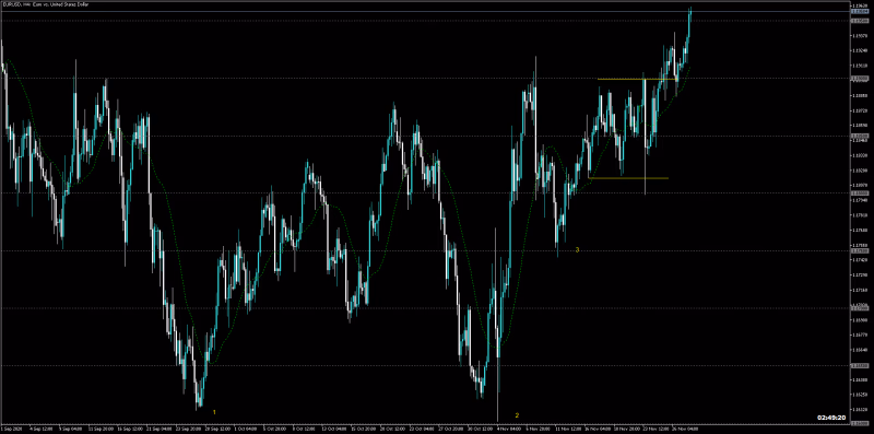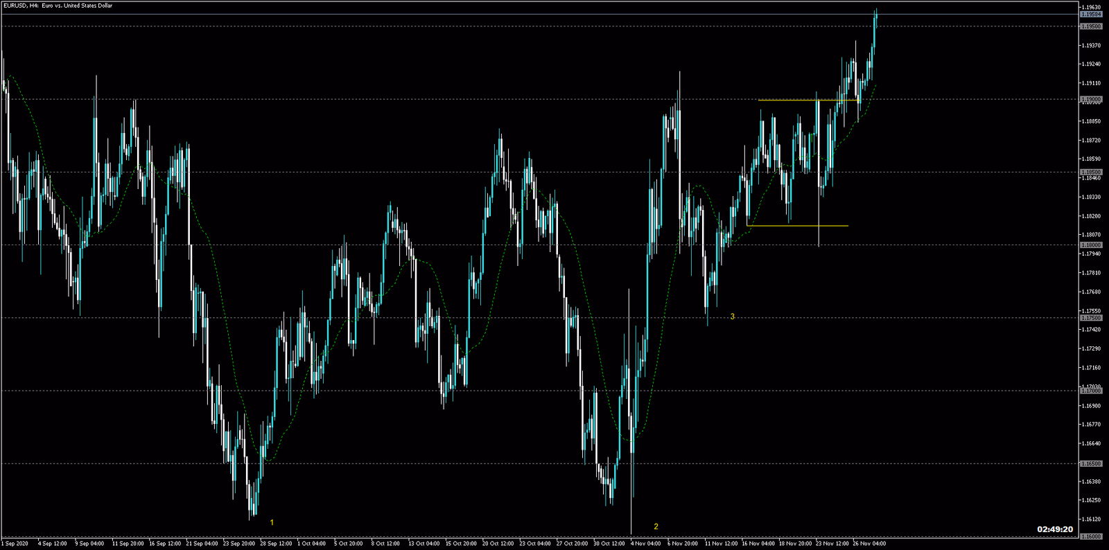 EUR/USD 4H足。日足の半値付近で1番底、2番底形成、3番の押し目で上がっていきました。