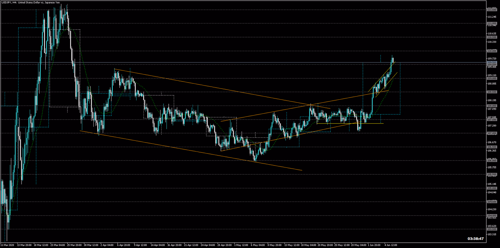 シナリオ:今日雇用統計、上昇が既に5波発生、目標の109.5円もほぼ届いている。レンジに移行する可能性もあります。108.85の仮ネックまで下がったら買い。