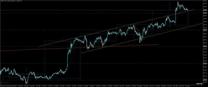 結果:NY時間で高値から下がって1H移動平均の所で買い。失敗しました。トレンドラインの上限でサポートされ買い、高値ブレイクして、109.10円でOCO設定して翌日利食い。