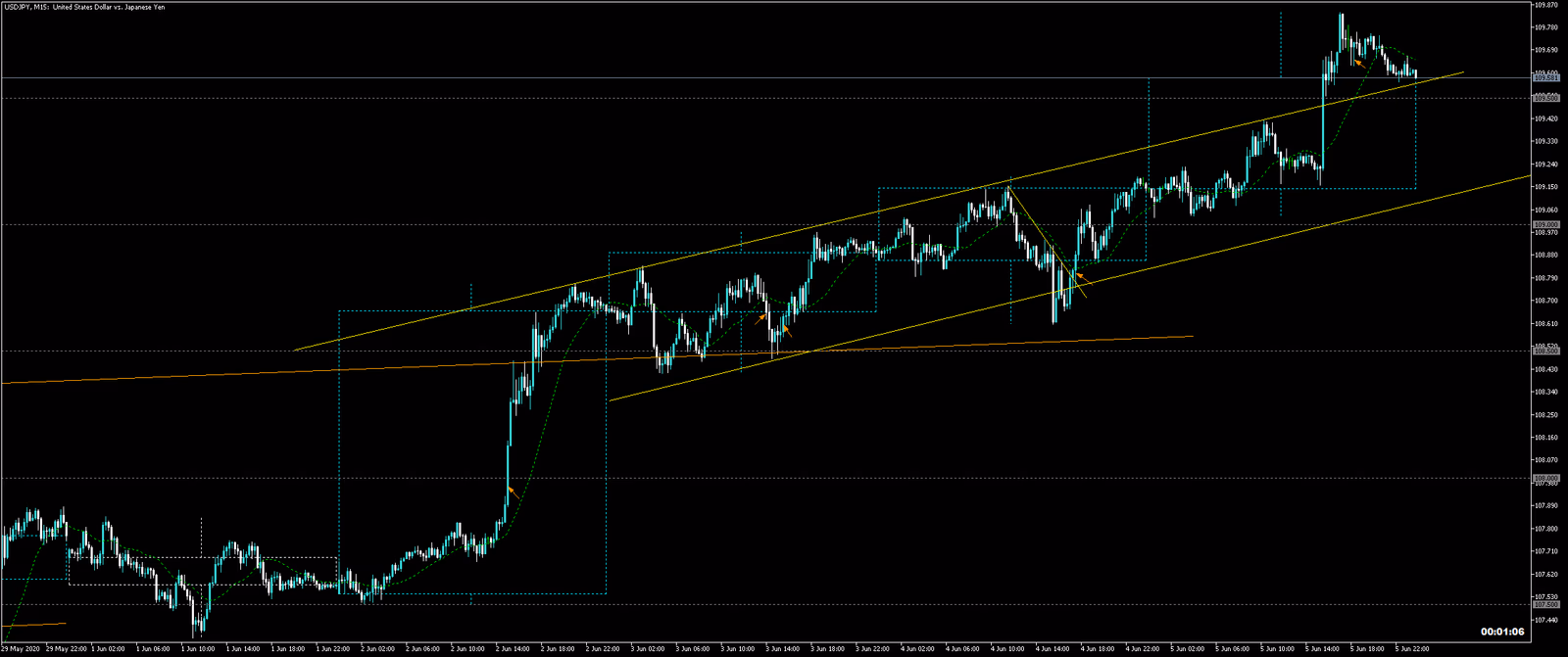 結果:もう一回レンジ下を試してからレンジブレイク。その後上昇トレンドで5波完了。雇用統計で109.5円超えました。