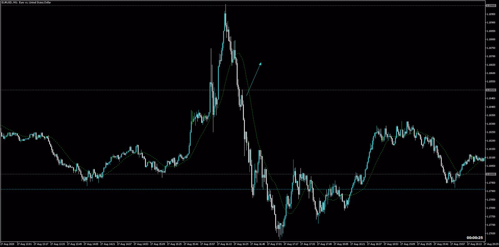 激しい動きの時のみ1分足を使えます。ブレイク後、戻った所矢印のイメージで押し目買いしようと思ったけど、Wボトルできず、切り下げラインも抜けないし、買う条件を整えなかったので買わないだけです。