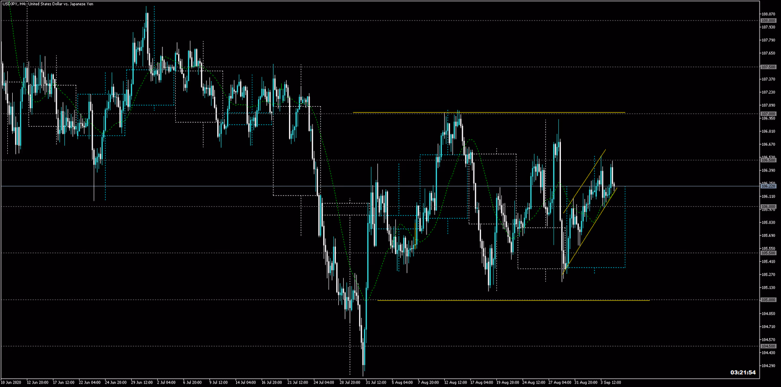・結果:欧州初動、1H移動平均を試してヒゲで高値ブレイク狙って買い。ブレイク後三波狙って追加で買い。106.5円狙ったけど、NY時間でも上がらずWトップで利食い。