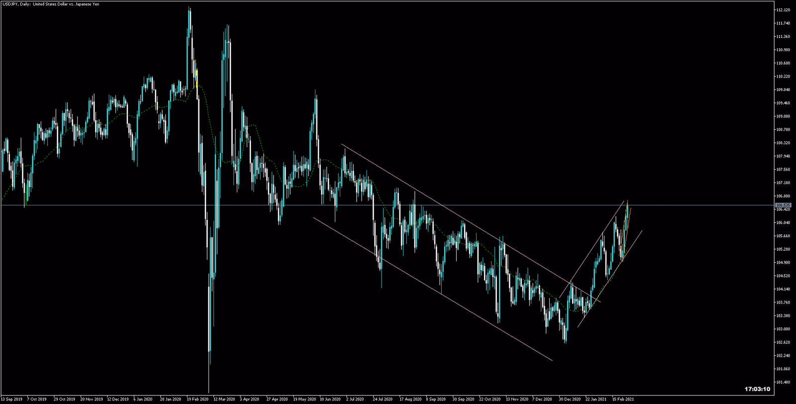 日足で見れば、2021年から上昇に転換して、日足の移動平均線サポートで上昇トレンドを形成しています。上昇チャンネルの波の道幅で大きな波を作る人が現れます。