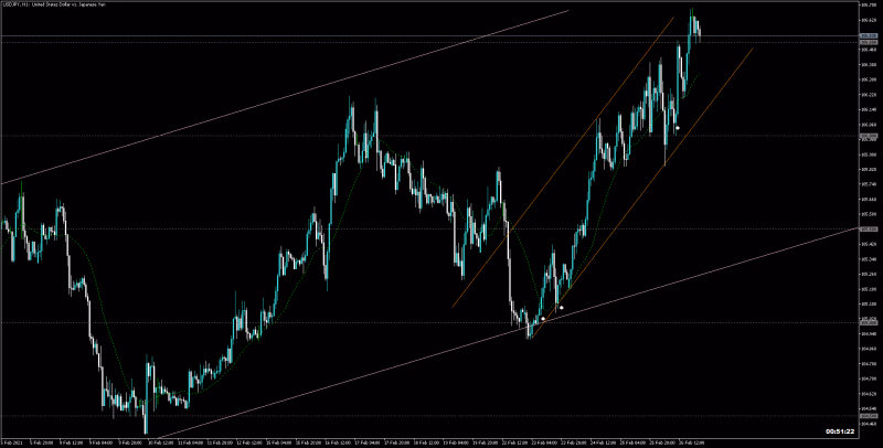 先の例。3波がずっと1H移動平均線サポートで上昇していて、106円付近で1H移動平均線割りました。そして5波目発生で急騰して106.5円で利食いです。