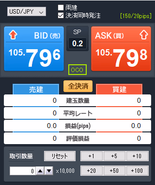 裁量トレーダーが利用する注文方法で、現在のレードで注文する方法。売買成立しやすいです。上記図のASK、BIDをクリックすれば成行注文を出せます。