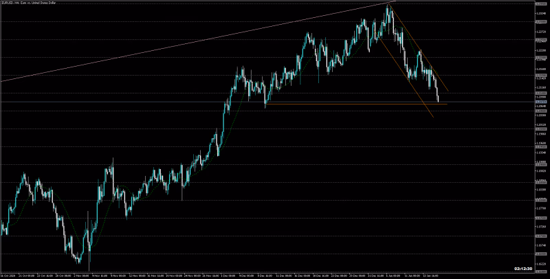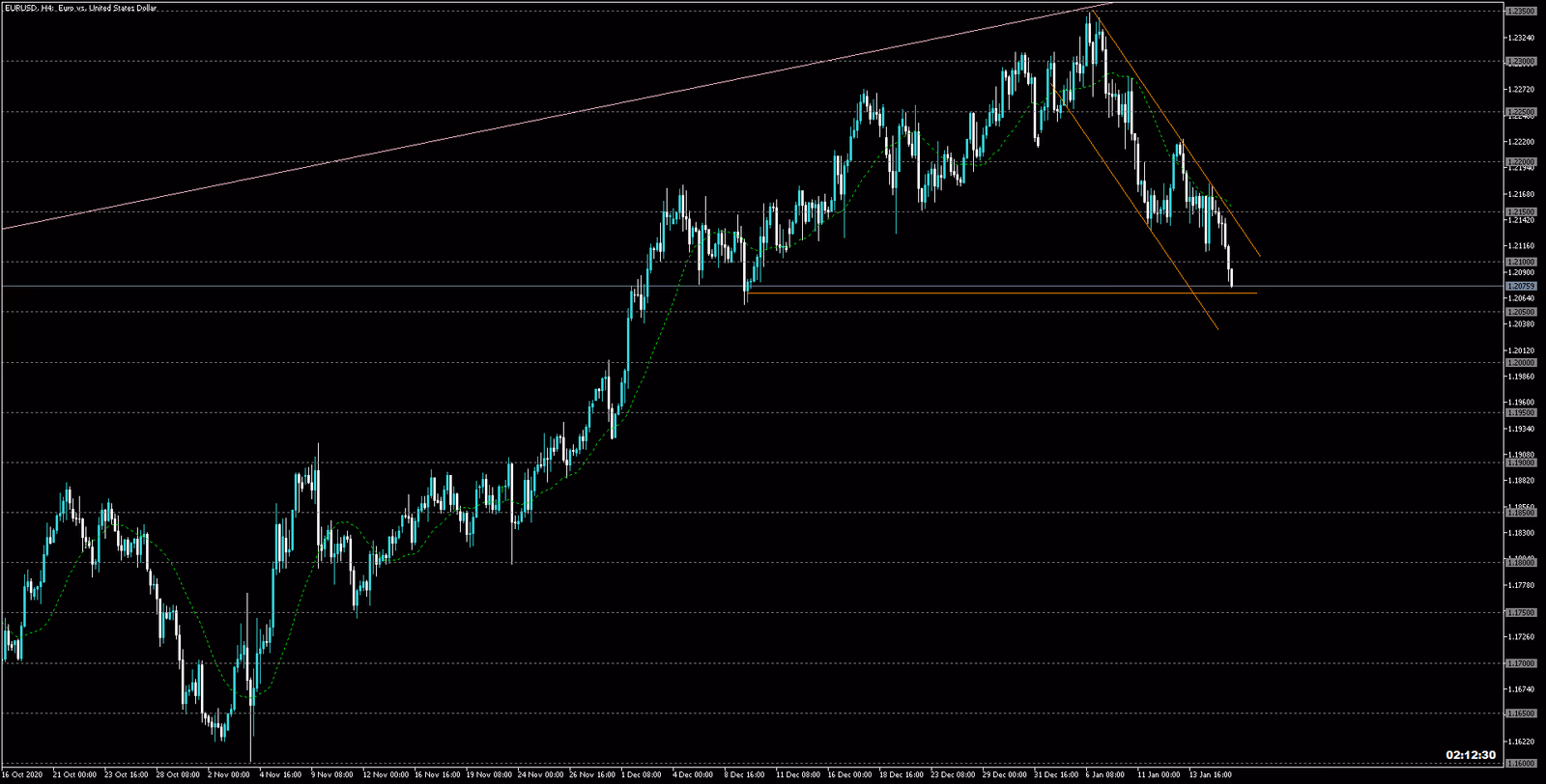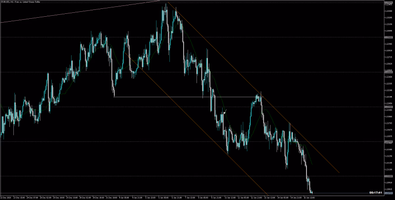 2021年1月のEUR/USDの1H足相場です。2020年高値のレジから過去トレンド形成中。2020の終値を割れまして、1Hの移動平均機能しています。1H移動平均線のマグネット効果で、接近を待ってから戻り売り。