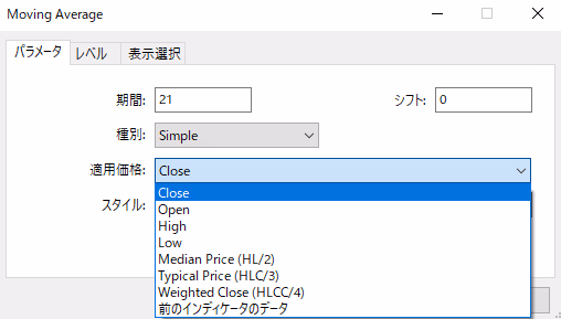 上記はMT5の移動平均線のパラメータ設定画面。4つの種別を選択できます。