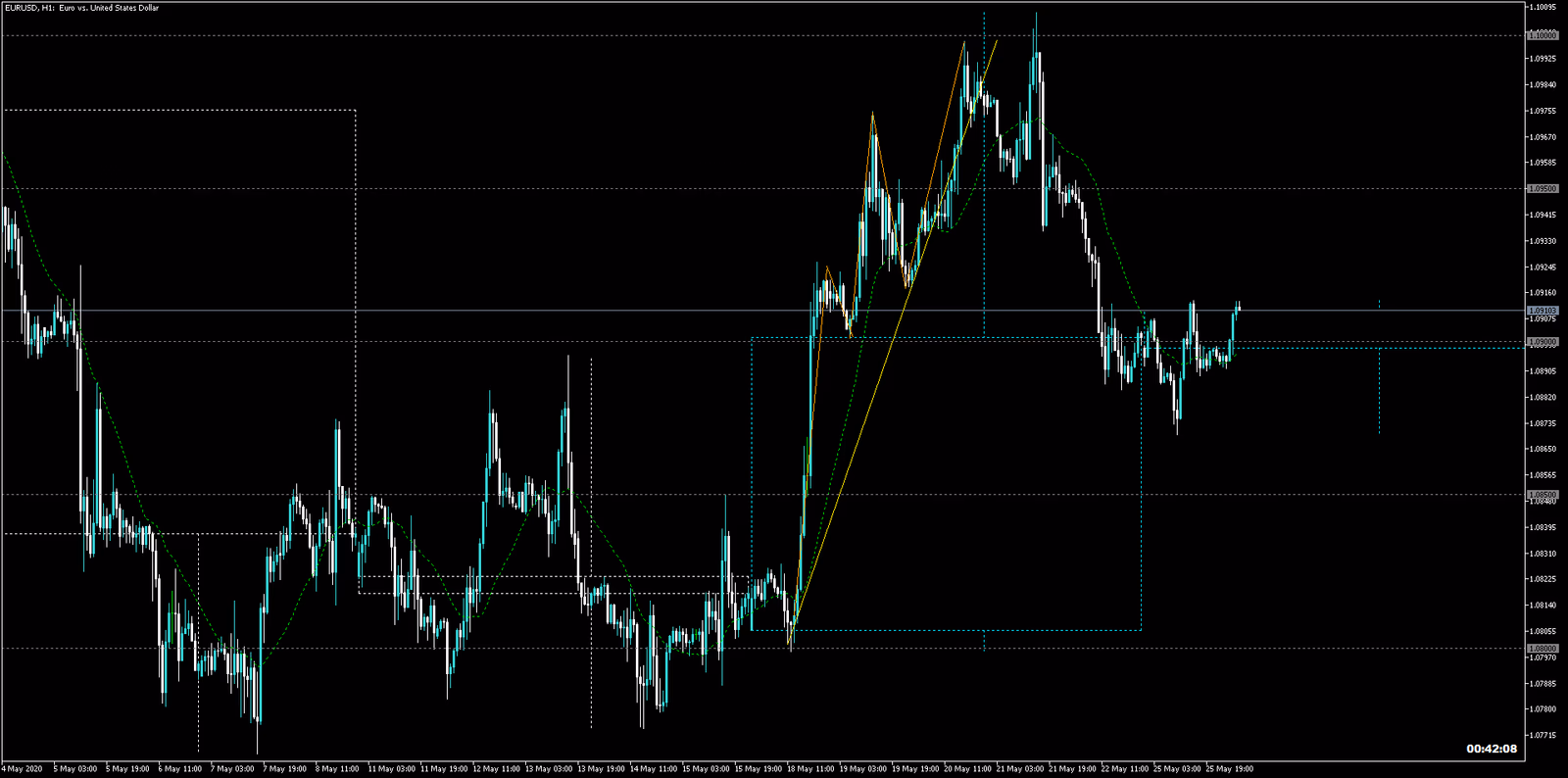 例として、上図のユーロドル、黄色の波をトレードするならスイング、オレンジ色の波でトレードするならデイトレ、そのより小さい波でトレードするならスキャルピングです。