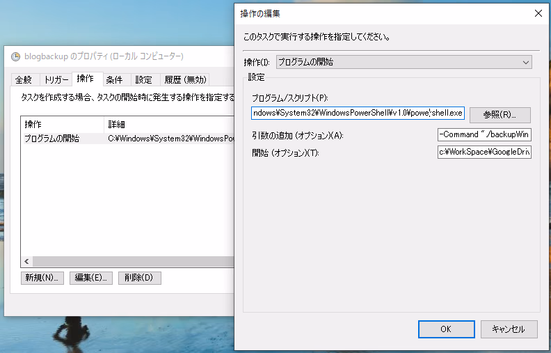 「操作」の設定: プログラム:C:\Windows\System32\WindowsPowerShell\v1.0\powershell.exe